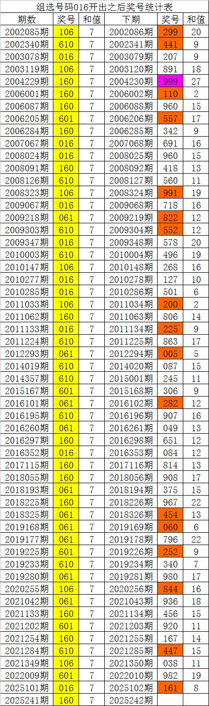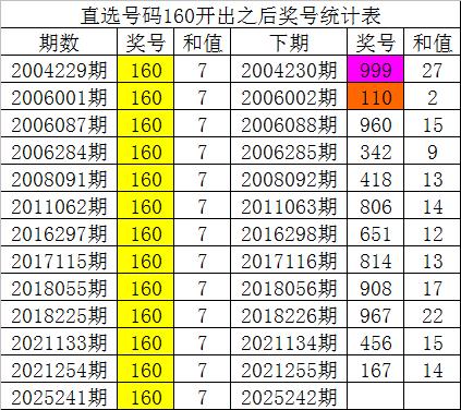 从以上统计可以看出,直选号码160出现之后,其下期奖号:1.下期合数出现概率100%;